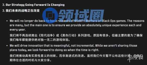 未来将不再连续推出《现代战争》或《黑色行动》系列作品。这出于多方面的考虑,但最主要的是为了确保每年都能为玩家带来真正独特、与众不同的游戏体验。