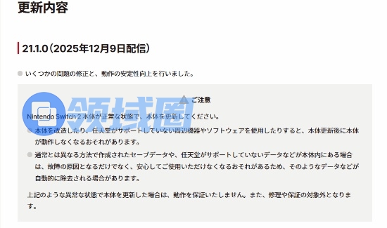 任天堂近日为Nintendo Switch 2推送了系统版本Ver. 21.1.0更新。本次更新说明与以往类似,仅提及“修复了若干问题,提升了系统稳定性”,并未公布具体功能变化。