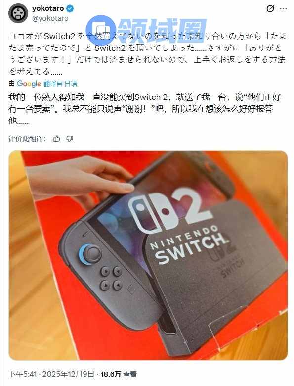横尾太郎透露,一位朋友得知他尚未购买任天堂新款主机Switch2后,以“刚好看到有卖”为由,直接赠予他一台主机。对于这份慷慨馈赠,他表示“仅用一句‘谢谢’实在过意不去”,目前正在认真思考如何妥善答谢对方。