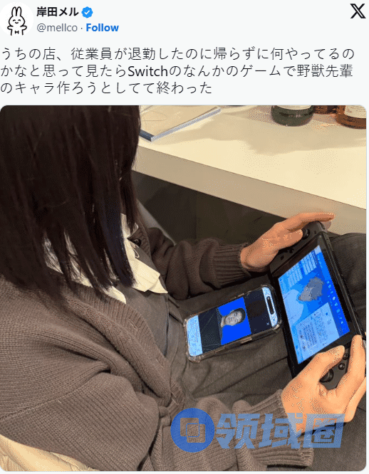 岸田梅尔发文表示,发现有员工下班后没回家,还在店里玩游戏,好奇之下便看了一眼她手上的Switch,结果发现她正在玩《闪电十一人 英雄们的胜利之路》,甚至还对着手机里“野兽先辈”的照片捏角色,不禁感叹:“这是在搞什么啦……www。”