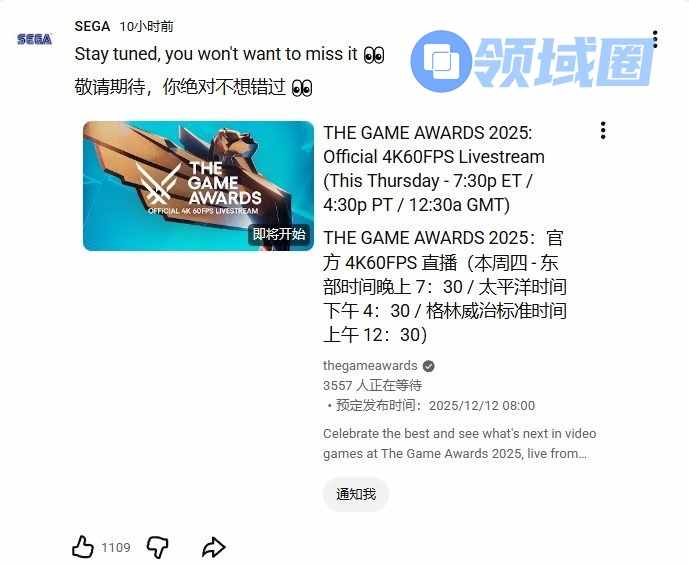 12月11日,世嘉在官方油管频道发布了一段主题为“敬请期待,你一定不想错过”的动态,正式确认将出席次日的游戏大奖颁奖典礼。该预告虽未透露具体内容,但已迅速引发玩家社区对可能公布新作的广泛猜测。