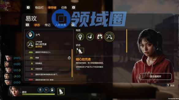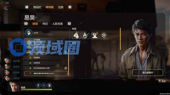 士气会受到以下方面影响:幸存者的状态与特质;特定消耗品;避难所随机事件;幸存者之间的关系;部分持续/永久性 Buff 或 Debuff...