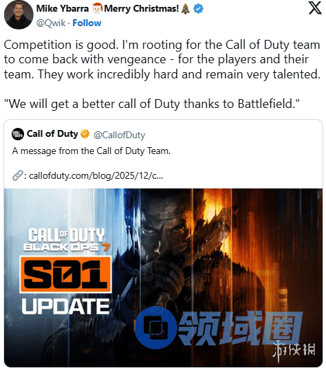 暴雪娱乐前总裁、Xbox前企业副总裁迈克·伊巴拉在社交媒体上表达了这一观点。“竞争是好事。我真心希望《使命召唤》团队能为了玩家和他们自己的团队,强势归来。”他写道,“他们工作异常努力,且才华依旧。”