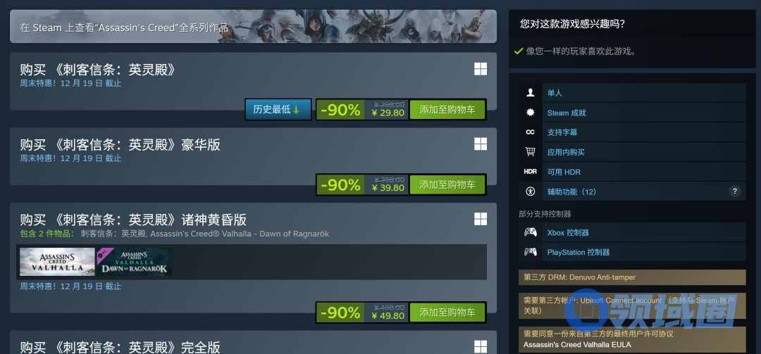 《刺客信条:英灵殿》在Steam开启周末特惠促销,该作标准版原价298元,现降价90%,当前仅售29.8元,为新史低。豪华版原价398元,同样1折促销,当前仅售39.8元。本次周末特惠截止12月19日。