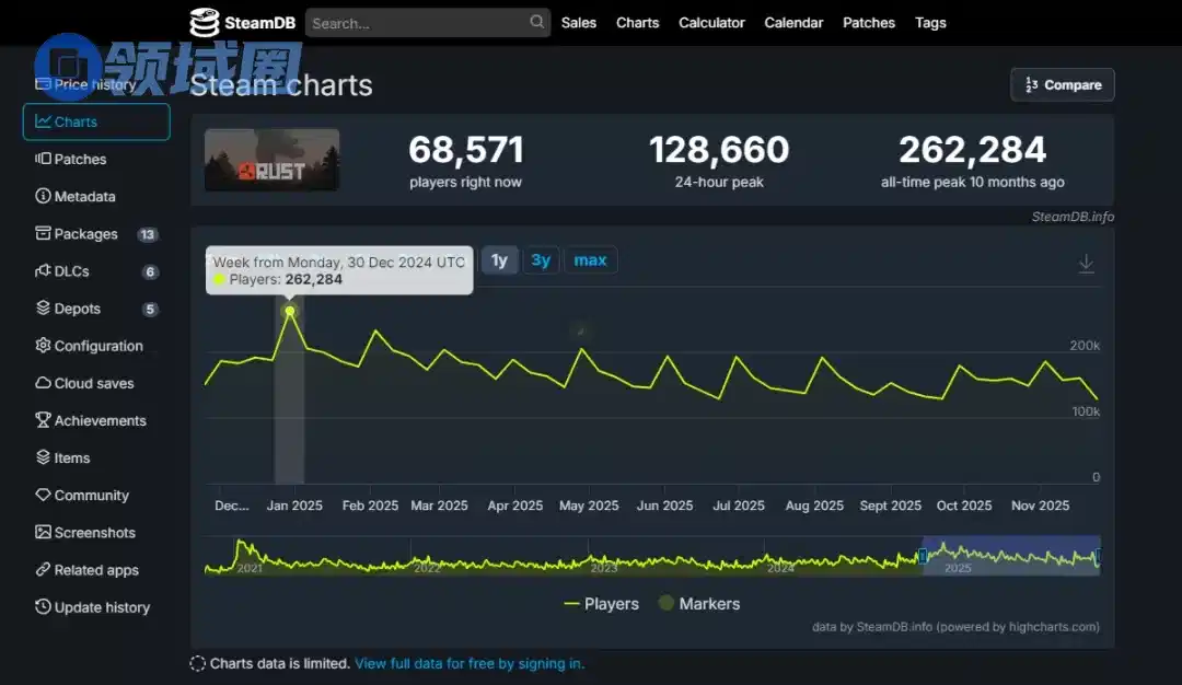 更令人惊叹的是,即便在发布十余年后,《Rust》在Steam平台上的同时在线玩家峰值仍能长期保持在15万左右,甚至在今年初曾创下超过26万的同时在线新纪录。充分证明了其核心玩法所拥有的持久魅力与社区活力。