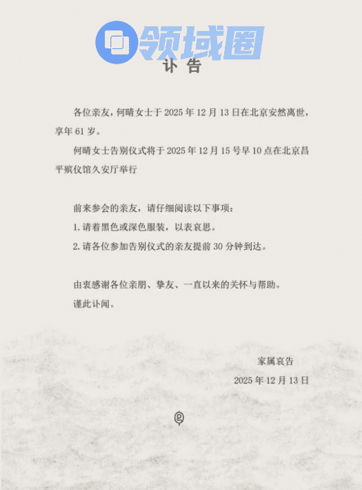 我国著名表演艺术家何晴于2025年12月13日在北京离世,享年61岁。家属发布的讣告显示,告别仪式定于12月15日上午在北京举行。何晴1964年出生于浙江江山,毕业于浙江昆剧团,1983年凭电影《少林俗家弟子》步入影坛。