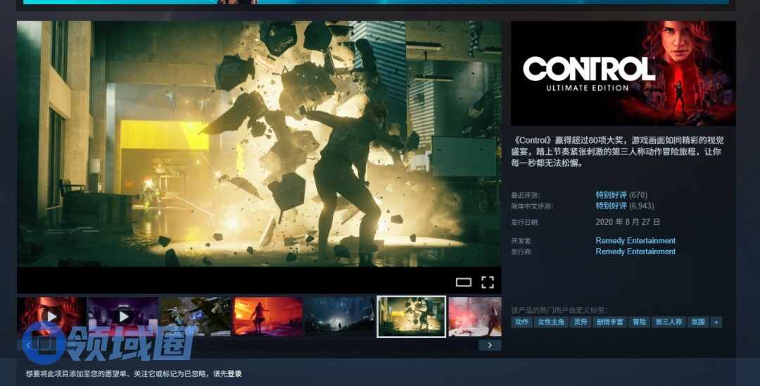 《控制1》于2020年8月才登陆PC Steam平台,目前为“特别好评”