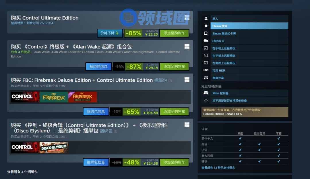 《控制1》Steam版正在促销,-85%,原价148元,现价22.2元,史低价14.8元