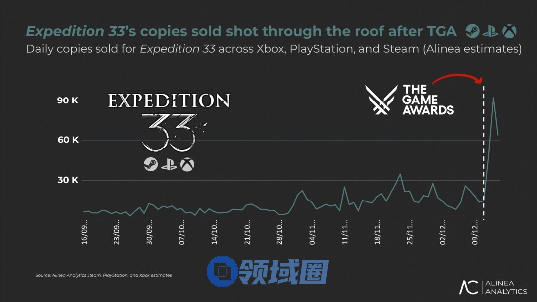 在刚落下帷幕不久的2025年TGA颁奖典礼上,《光与影:33号远征队》史无前例地横扫九项大奖,包括年度游戏。最新数据显示,这份巨大的荣誉直接转化为了显著的商业成功。