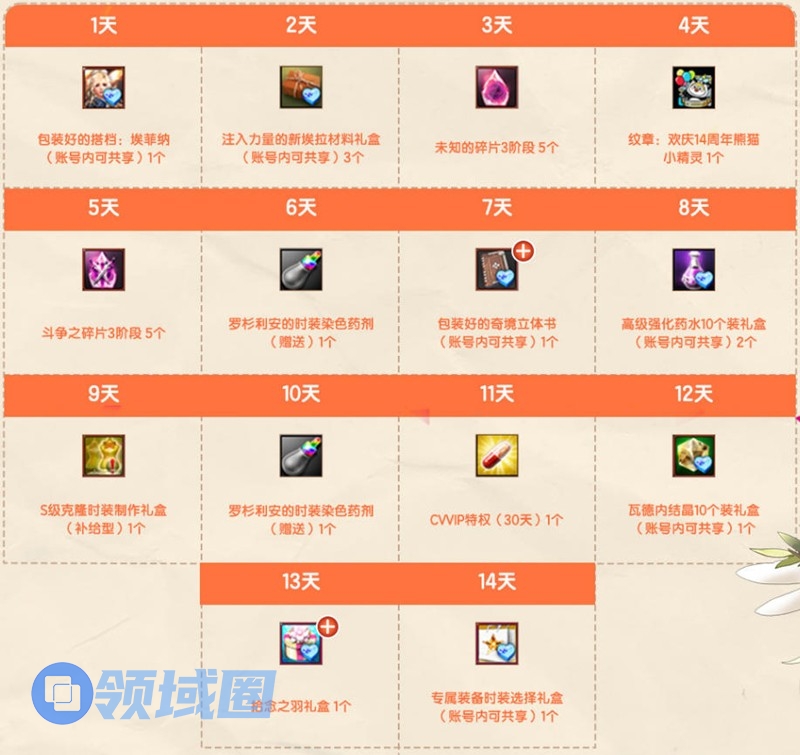 首先,就是于2025年12月16日维护后至2026年1月13日维护前,英雄们每日累计在线满30分钟,即可获得累计签到奖励,其中包含包装好的搭档:埃菲纳、纹章:欢庆14周年熊猫小精灵、S级克隆时装制作礼盒(补给型)、CVVIP(30天)、拾念之羽礼盒以及装备时装选择礼盒等!