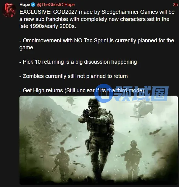 在动视不再延续《使命召唤》最近几年的“现代战争”和“黑色行动”两大子系列交替推出的策略后,舅舅TheGhostOfHope在社交媒体上爆料,称2027年的《使命召唤》由大锤开发,将开启一个全新的子系列,采用一批全新角色,时间设定在1990年代末或2000年代初。