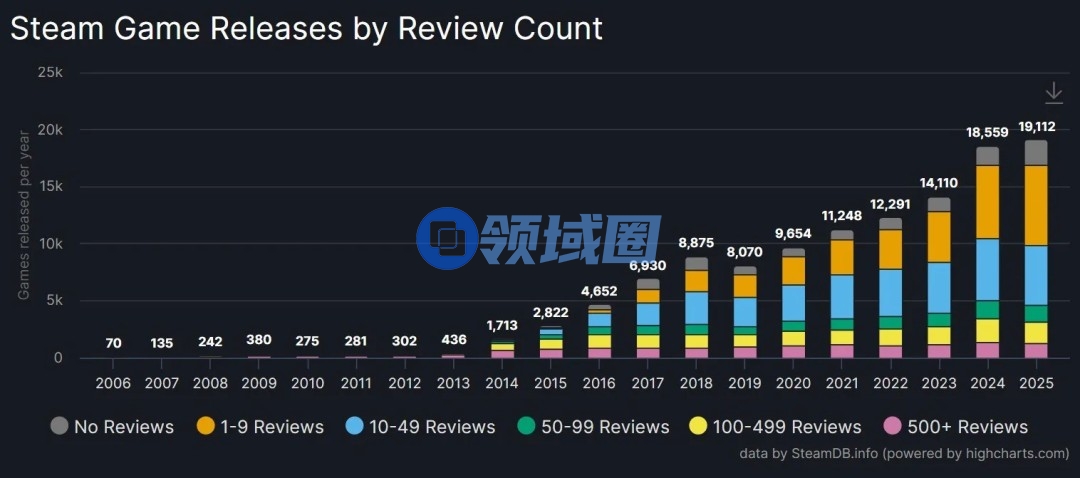 2025年发布的19112款游戏中,有9327款的评测数少于10 条。在这之中,更有2229款游戏至今未收到任何用户评测。这意味着今年上线的游戏里,超过十分之一完全缺乏来自玩家的反馈,无法为潜在买家提供任何参考依据。
