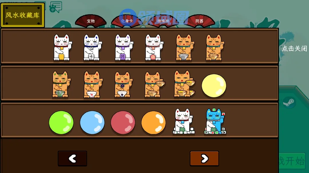 游戏融入可爱又搞怪的猫咪与风水元素,玩家需要将宝物摆放在对应的风水位置以触发额外加成。宝物拥有不同定位与技能,可根据构筑方向进行选择,从而进一步放大增益,实际爽感“翻一翻”。