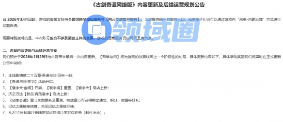 《古剑奇谭网络版》于今日发布公告,明确了游戏未来的运营规划。官方宣布,游戏预计于2026年1月29日上线名为“吾谁与归”的最终章主线剧情更新,为历时七年的故事线画上阶段性句号。此次更新后,游戏将不再推出新门派、新大型团队副本等大规模内容,正式转入以稳定维护为主的运营阶段。