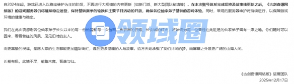 此次公告标志着这款运营已七年的MMORPG将逐步淡出内容更新的舞台。官方在公告中以“长卷有极,此情不尽”作结,感谢玩家长期以来的陪伴,并祝愿玩家在游戏之外的“更广阔的山海人间”拥有精彩生活。