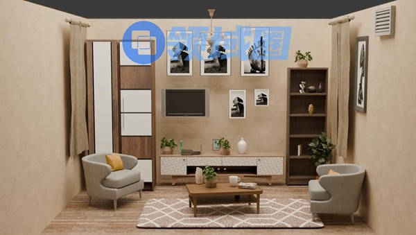 此处为输入提示词"一间温馨的客厅,配有舒适的扶手椅、画廊墙和时尚的咖啡桌"后生成的效果图示意